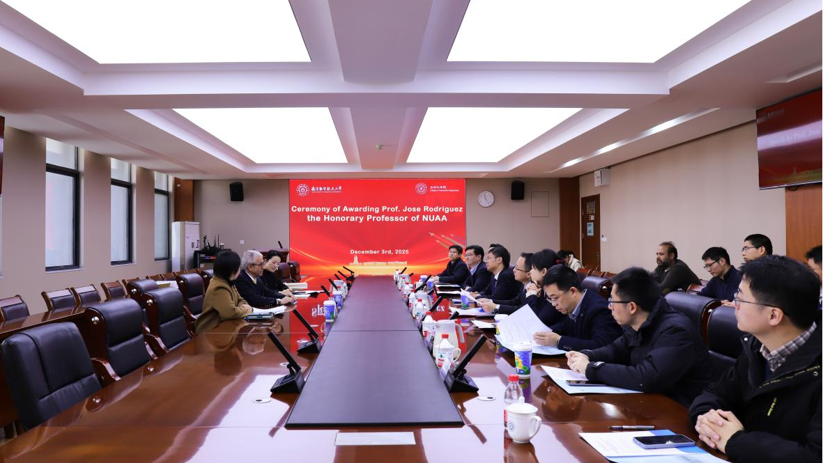 12月3日,智利工程院院士、智利圣塞瓦斯蒂安大学教授Jose Rodriguez受聘为南京航空航天大学名誉教授的仪式在自动化学院举行。南京航空航天大学校长助理潘时龙为Jose Rodriguez院士颁发名誉教授聘书,并为其佩戴校徽。国际化部部长赖际舟,国际合作处副处长徐智鑫,自动化学院党委书记李文雷,自动化学院副院长魏佳丹、陈杰及学院相关教师参加。仪式由李文雷主持。